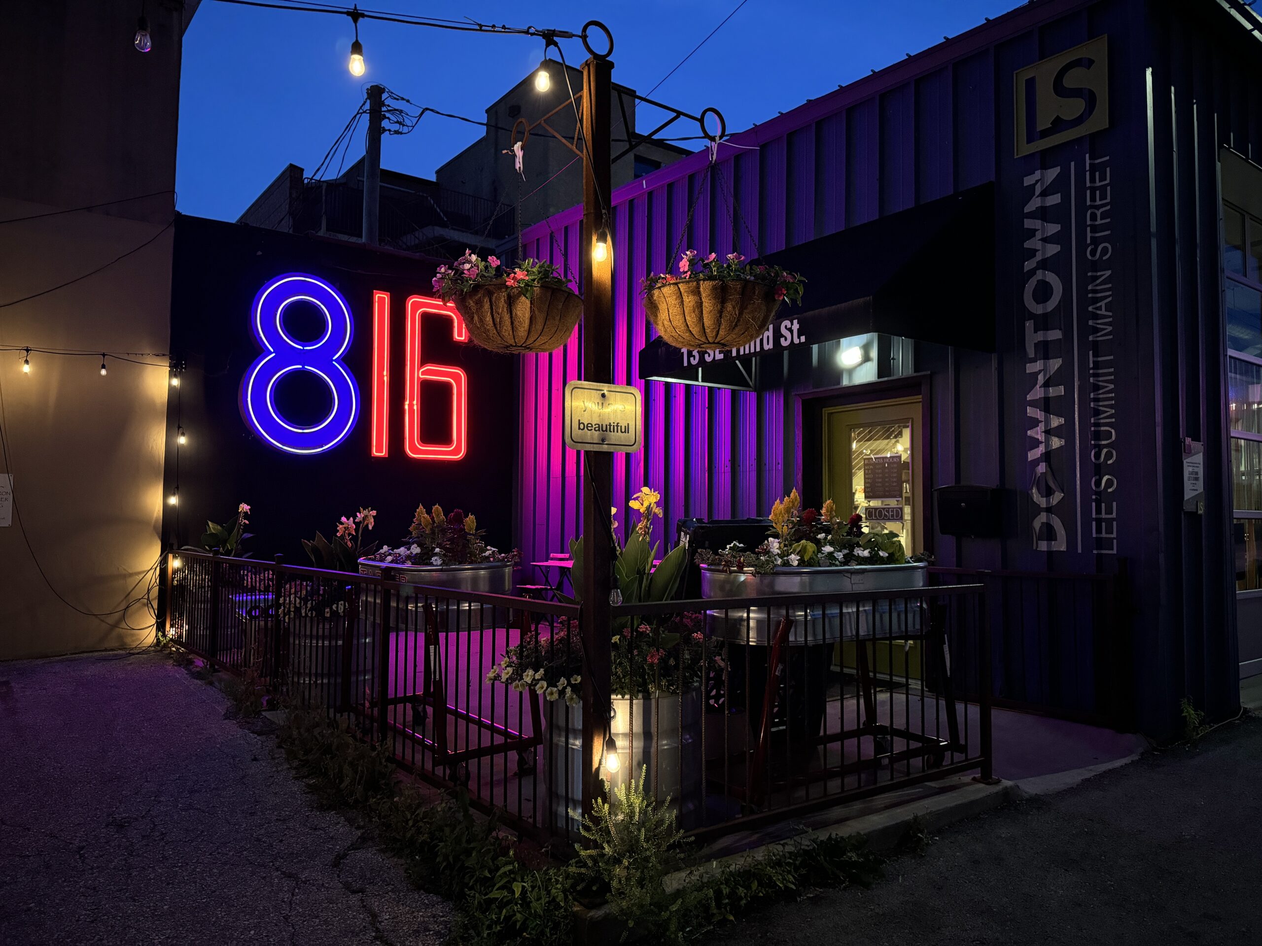 Created by Fossil Forge Design from salvaged numerals from the old EastGlen 16 Theater, these bright neon numbers illuminate the alleyway where Downtown Lee's Summit Main Street's office resides. This alleyway was once a rough pass-through, and now it has been transformed into a vibrant meeting place for many of the experiences and activities that Downtown Lee's Summit hosts throughout the year. Why 816, you ask? Well, 816 is Downtown Lee's Summit's area code.
