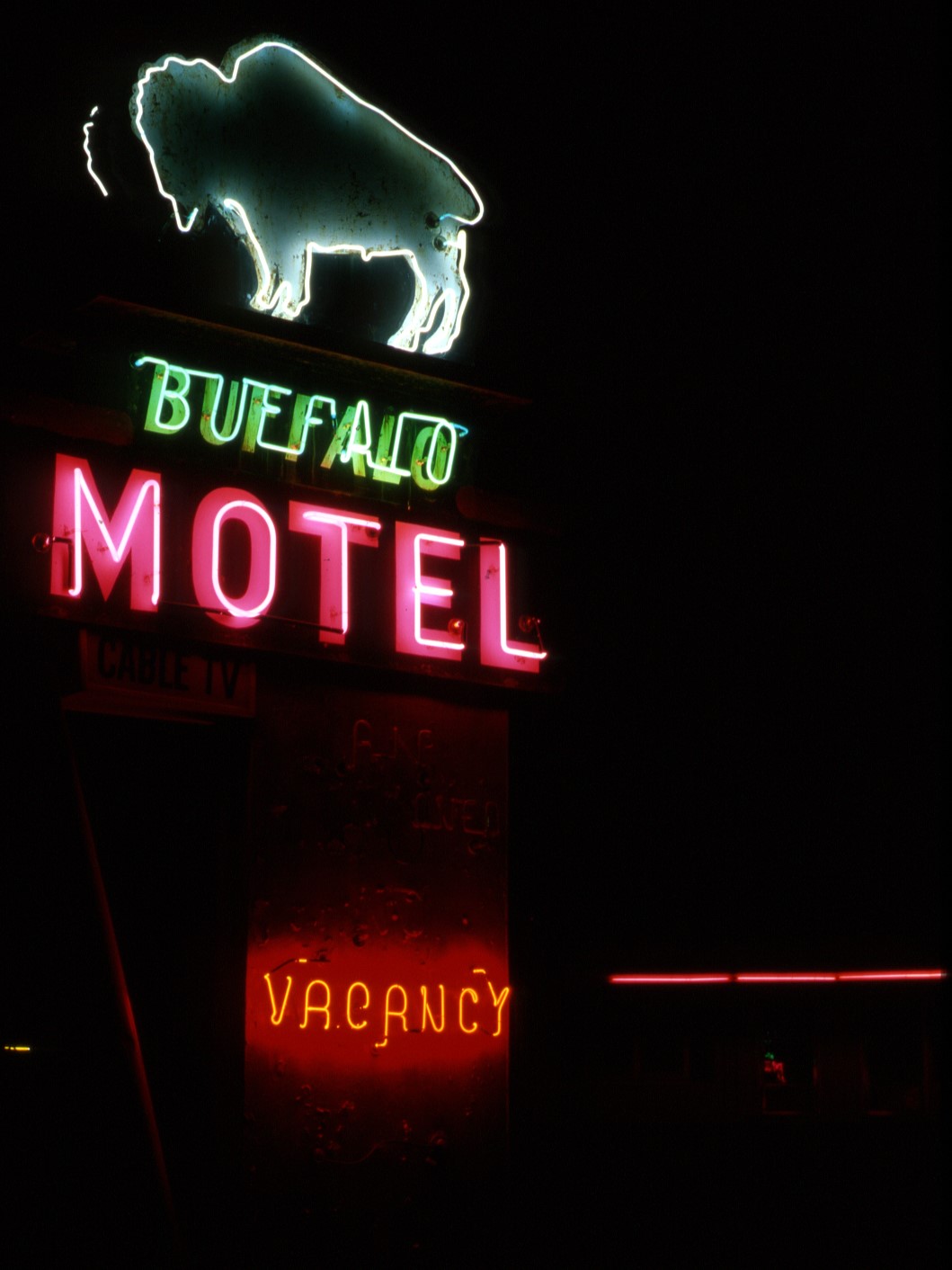 I have always been enamored by the glow of a neon sign. The color, warmth, and magnetism of neon sets it apart from all other light sources. This road trip takes us to a stretch of Highway 65 on an April evening in 1999. It was my first year working as a photographer at MU in Columbia, and during spring break, I decided to take a road trip and drive down Route 66 in search of places to photograph. I remember driving all the way to the middle of Oklahoma over the course of three days before turning around and coming back up Highway 65. Driving through Buffalo, Missouri, at night, I was captivated by the neon glow of the Buffalo Motel. Like all of my photographs taken at this time, this image was captured using color slide film and a Nikon camera. The trip up and down Missouri’s highways yielded a number of photographs of roadside locations and structures now gone from our cultural landscape. This image of the Buffalo Motel neon sign was one of my favorites.