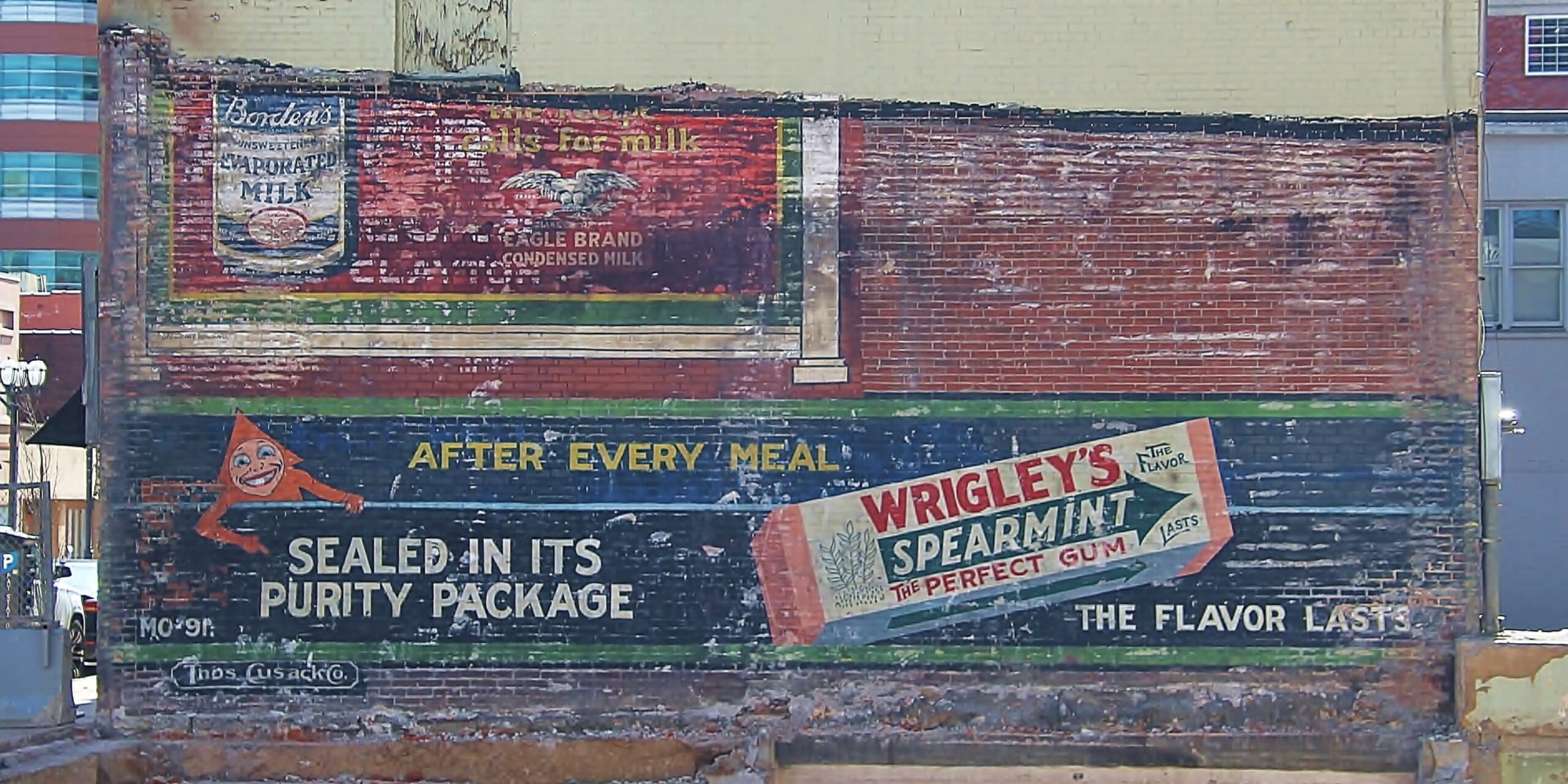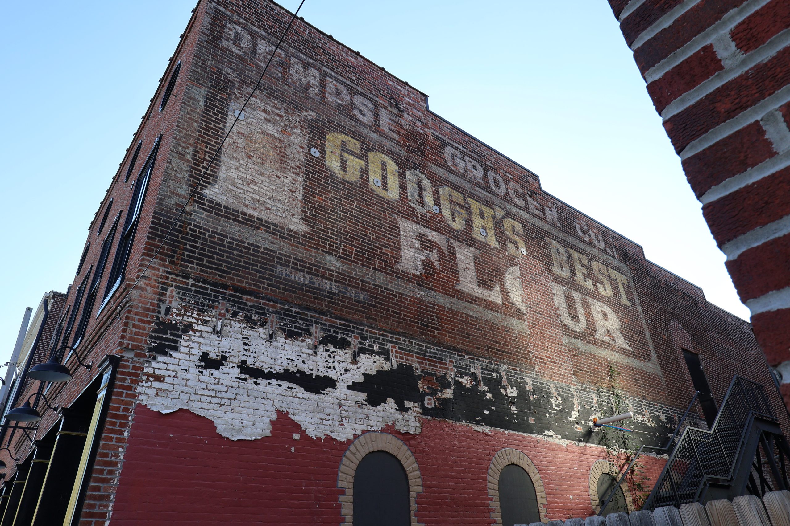 This advertisement for Dempsey Grocer’s was revealed in 2019 when a metal balcony was removed from the building. Dempsey Grocer was a foundational business in Cape Girardeau from 1870 to about 1925. The sign was most likely painted closer to 1870 making it one of, if not the oldest painted sign within Cape Girardeau. Old Town Cape has expressed interest in preserving this beautiful piece of advertising.