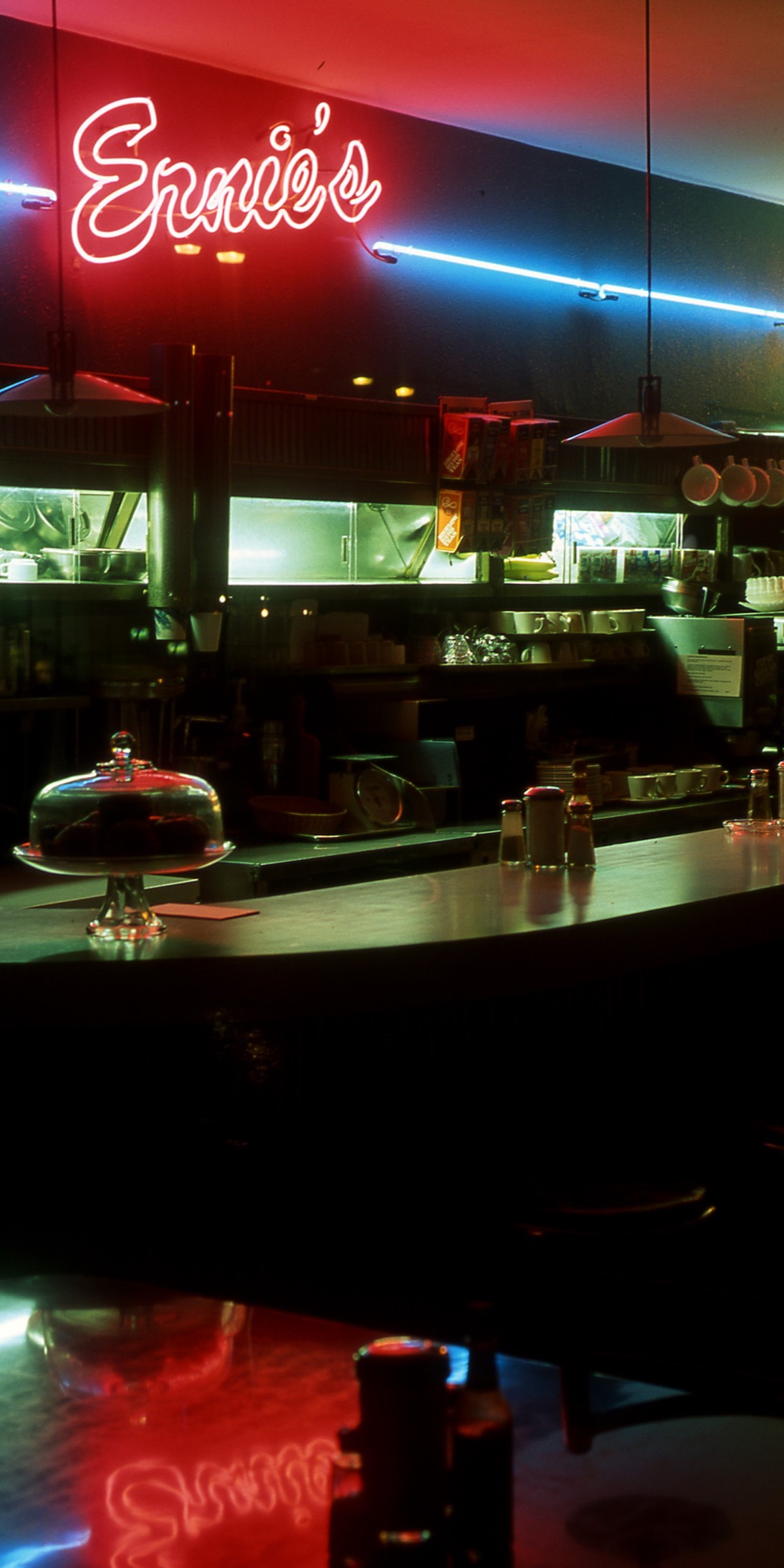 This photograph was taken on color slide film sometime between the fall of 1998 and the early winter of 2000. This was a time in my creative career when I was photographing various locations and scenes in Colombia. I was fascinated with neon, wherever I could find it emitting its warm, colorful glow. Some of the better neons in Columbia at the time included Ernie’s Café, the legendary neon of Peking on Ninth, The Broadway Diner, the Bull Pen Café, its pink neon letters beckoning travelers off the highway, the Eastwood Motel, perhaps Columbia’s loftiest neon sign ever erected, the vintage neon of the Arrow Head Motel, and the neon interiors of Ernie’s and Booches. For some inspired reason, I made a point of hunting down and photographing as many of Columbia’s neon signs as I could, especially between 1998 and 2003. That brings us back to Ernie’s on this particular night, it's classic and elegant interior clean and prepared for the next morning’s breakfast crowd, the countertop set with salt, pepper, sugar and Tabasco, a large stack of paper coffee filters quietly awaiting use, and the neon glow of the Ernie’s sign reflected softly in the polished Formica of a tabletop.