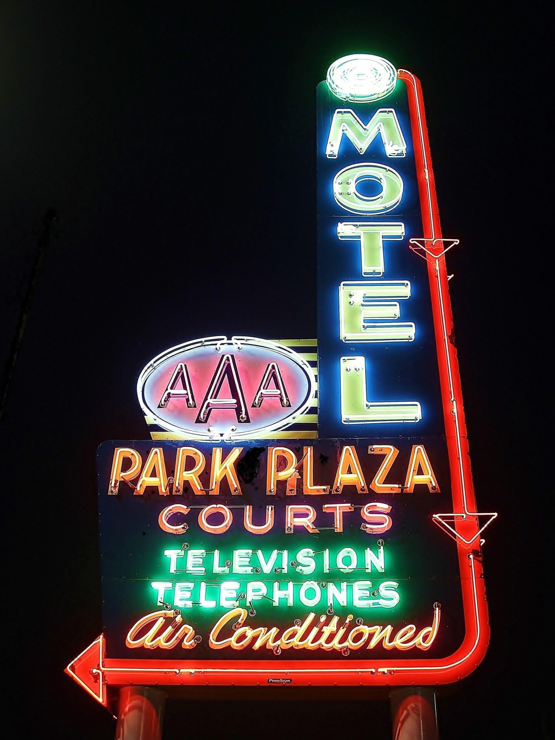 The Park Plaza neon sign, which welcomed travelers at the intersection of Watson Road and Lindbergh Road (two Old Route 66 "alignments") in south St. Louis County, has been reconditioned and reinstalled at its original location, which is now the Holiday Inn Route 66! This intersection is also the site of the first "cloverleaf" west of the Mississippi!