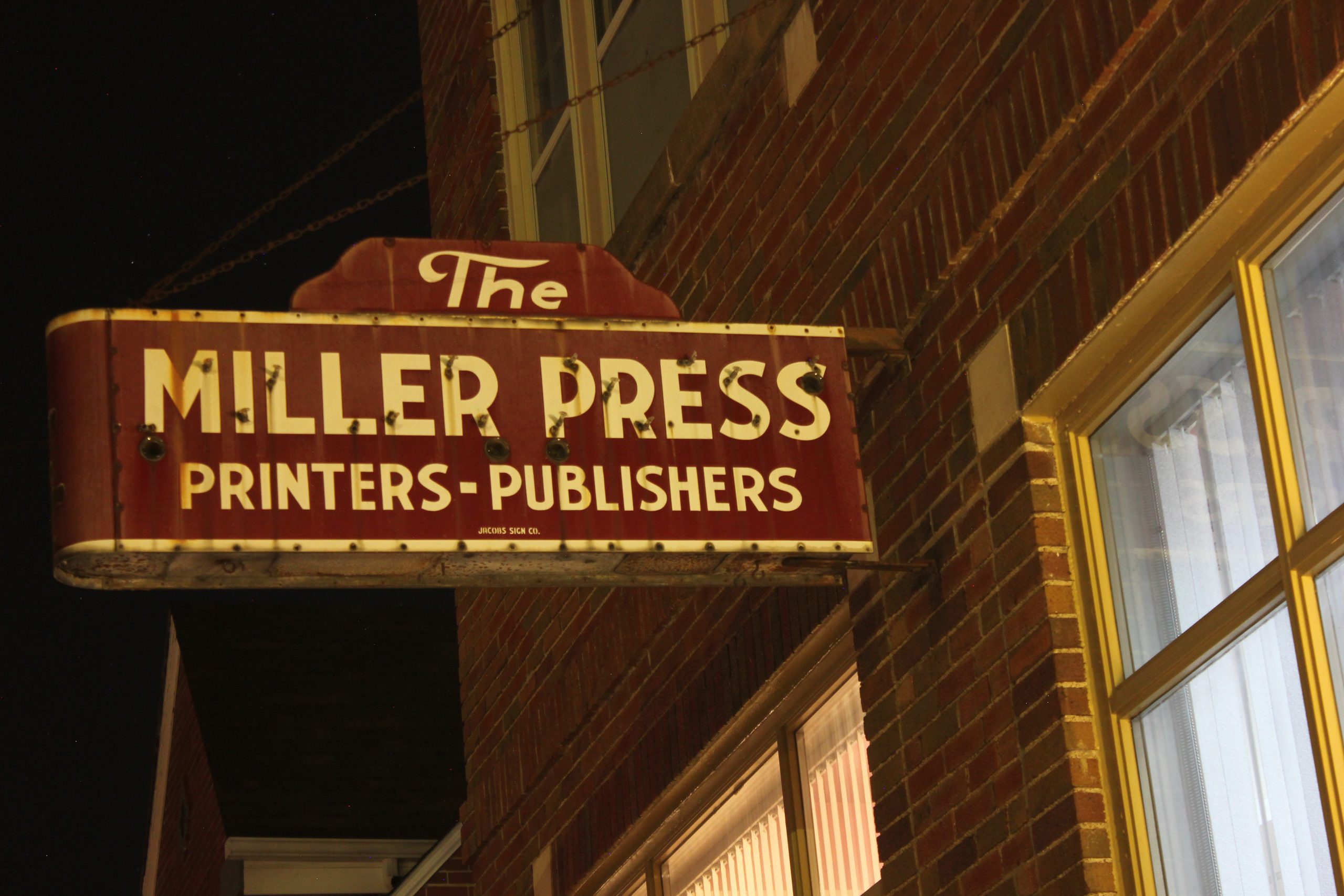 Originally known as The Brueggenjohann Building, this office/residential building was constructed in 1927 by Walter Brueggenjohann. Walter and his brother, Hugo, owned H & W Brueggenjohann Plumbing & Repairing in 1924 located at 812 W. Fifth Street. Hugo left the company in early 1927 for another venture. Walter then dropped the H from the business name, and invested in the construction of this building where he moved both his business and his family. In 1931, Walter invented a water heater called STA-HOT and changed the name of his business to STA-HOT Water Heater Corp: Plumbing and Heating Contractors. He sold the building to Jul. H. Conrads in 1937. The Miller Press had moved in by 1940 and put up this amazing neon sign. In 1955, Walter Brueggenjohann was contracted to install a warm air heating system in the city auditorium. The building owner plans is in the process of restoring the sign as of December of 2025.
